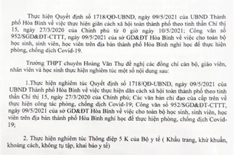 Thực hiện Chỉ thị số 05/CT-TTg ngày 28/01/2021 của Thủ tướng Chính phủ về một số biện pháp cấp bách phòng, chống dịch Covid-19; Chỉ thị số 79/CTBGDĐT ngày 28/01/2021 của Bộ Giáo dục và Đào tạo về một số biện pháp cấp bách phòng, chống dịch Covid-19 trong các cơ sở giáo dục và đào tạo; Chỉ thị số 07/CT-TU ngày 29/01/2021 của Ban Thường vụ Tỉnh ủy Hòa Bình về việc đẩy mạnh các biện pháp cấp bách phòng, chống dịch Covid-19 trên địa bàn tỉnh Hòa Bình trong tình hình mới;