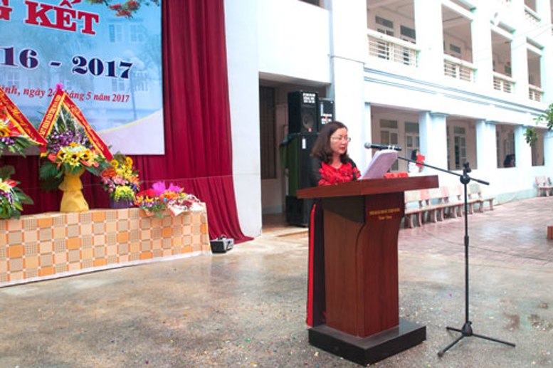 Buổi lễ được chính thức bắt đầu với màn chào cờ đầy thiêng liêng, trang trọng trong tiếng hát quốc ca vang vọng, hào hùng của học sinh toàn trường. Trong không khí dạt dào cảm xúc, cô giáo Lê Thị Hồng – Hiệu trưởng nhà trường đã có bài phát biểu tổng kết, đánh giá những kết quả nhà trường đã đạt được trong năm học 2016 – 2017. Bài phát biểu đã thổi bùng khí thế phấn đấu và niềm tin vào tương lai phát triển vững mạnh của nhà trường.