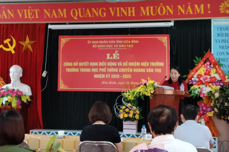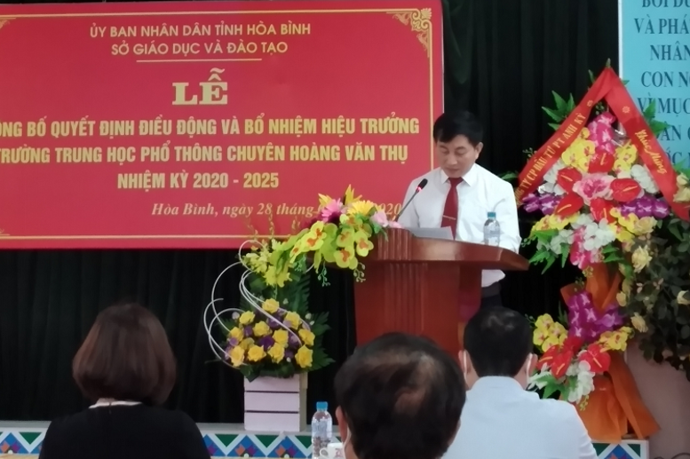 Phát biểu tại đây, Phó Giám đốc Sở GD&ĐT Hoà Bình, đ/c Đinh Thị Hường nhấn mạnh Trường THPT Chuyên Hoàng Văn Thụ giữ vị trí quan trọng đối với ngành giáo dục tỉnh Hoà Bình, là nơi tập trung các nhà giáo giỏi nghề, tâm huyết, trách nhiệm trong sự nghiệp giáo dục. Đ/c Phó Giám đốc đề nghị đ/c Bùi Văn Đường trên cương vị mới sẽ bắt nhịp nhanh với yêu cầu của công việc, cùng với tập thể nhà trường đoàn kết, sáng tạo, hoàn thành xuất sắc nhiệm vụ được giao.