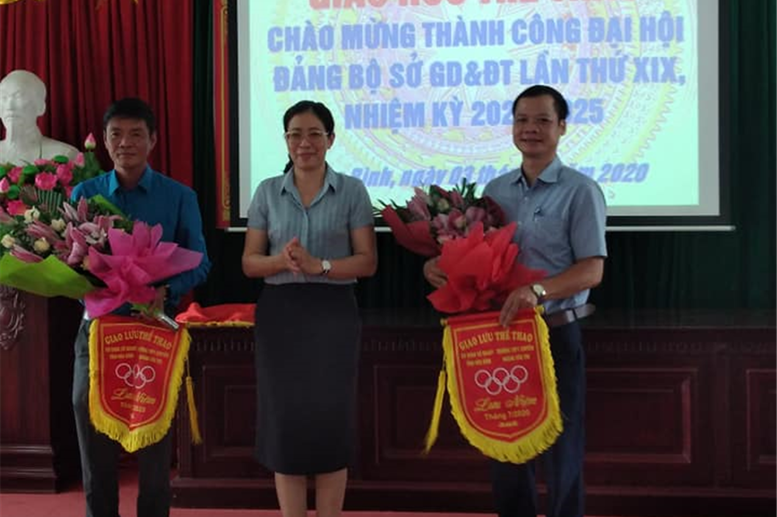 Ảnh BTC: Đ/c Bùi Thị Kim Tuyến- Giám đốc Sở GD&ĐT tặng hoa và cờ lưu niệm chúc mừng hai cơ quan có VĐV tham dự giao hữu thể thao