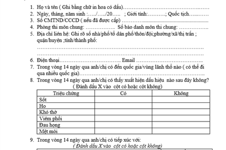 Thí sinh dự thi Tuyển sinh lớp 10 THPT chuyên Hoàng Văn Thụ năm 2021 cần có tờ khai báo y tế theo mẫu dưới đây