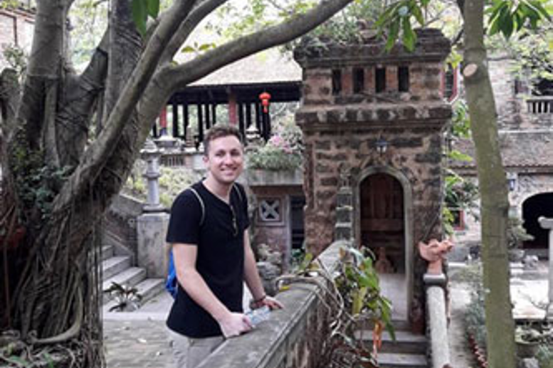 (Ảnh: Thầy giáo trợ giảng người Mỹ trải nghiệm văn hóa tại Việt Phủ Thành Chương)