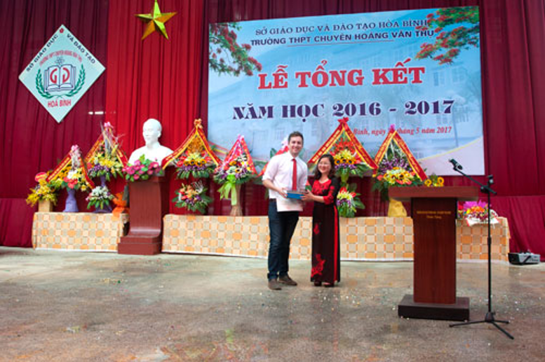 Trong buổi lễ, nhà trường đã trao tặng giấy khen cùng quà lưu niệm cho thầy giáo trợ giảng người Mỹ Samuel Jefrey như một cách thể hiện tình cảm đối với những đóng góp mà thầy giáo đã dành cho nhà trường trong năm học 2016 – 2017. Đáp lại tình cảm của nhà trường, thầy giáo trẻ 24 tuổi cũng đã xúc động thể hiện tình yêu và sự gắn bó với mái trường trong những lời phát biểu ngắn gọn, chân thành.