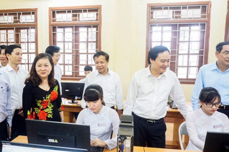 (Bộ trưởng Phùng Xuân Nhạ tới thăm phòng tin học nhà trường)