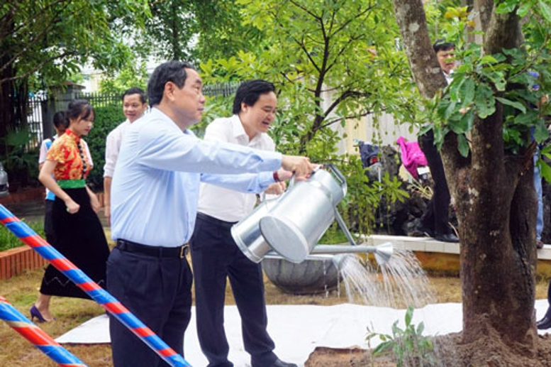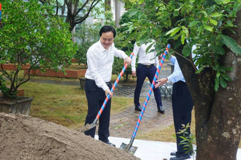 (Bộ trưởng Phùng Xuân Nhạ trồng cây lưu niệm tại trường THPT chuyên Hoàng Văn Thụ)