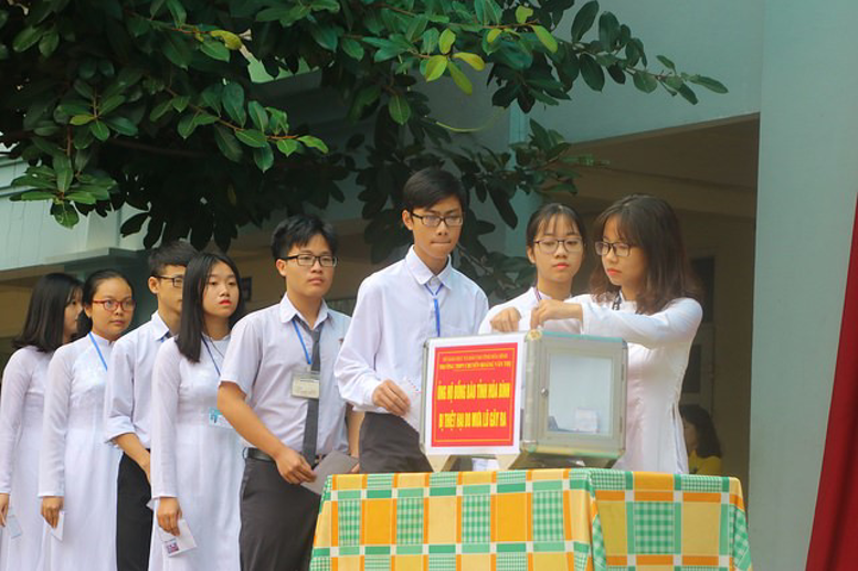 Học sinh đại diện các khối lớp của Nhà trường ủng hộ quyên góp đồng bào vùng lũ