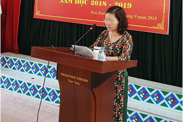 Ảnh BTC: Đ/c Lê Thị Hồng – Bí thư Đảng bộ, hiệu trưởng nhà trường phát biểu chỉ đạo, báo cáo triển khai nhiệm vụ năm học 2018-2019